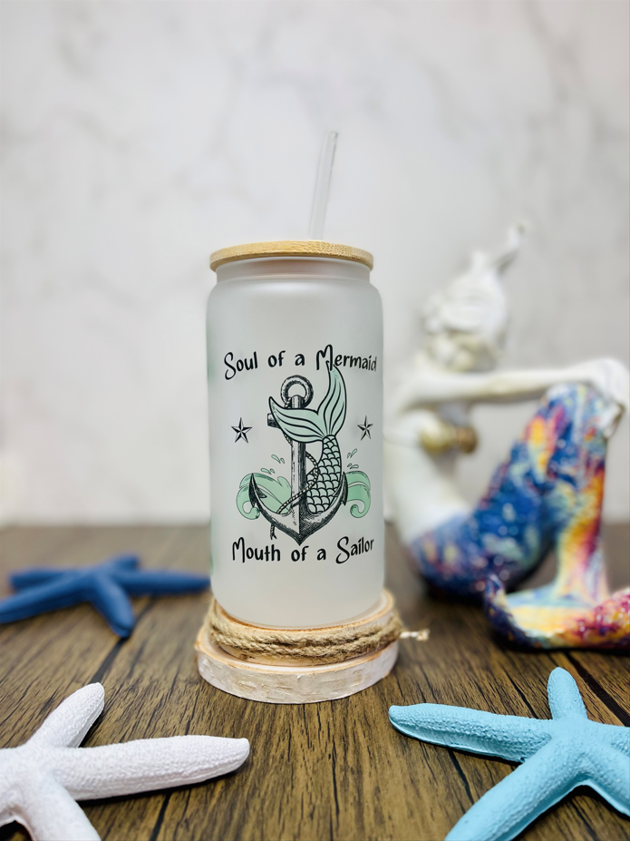 Soul of a Mermaid Mouth of a Sailor 16oz. Glass Beer Can w/ Bamboo lid and straw